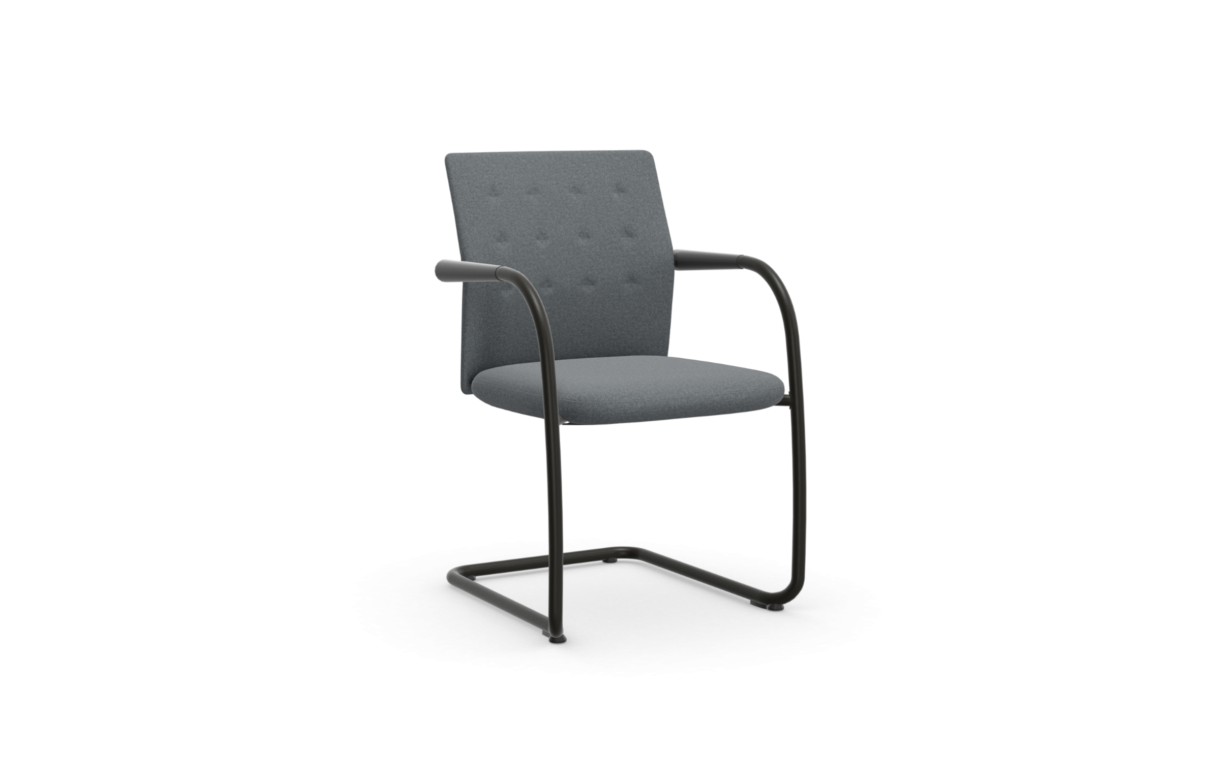 Base: tubular steel cantilever base, in chrome or powder-coated in basic dark or soft grey. Can be stacked (max. 4 chairs).