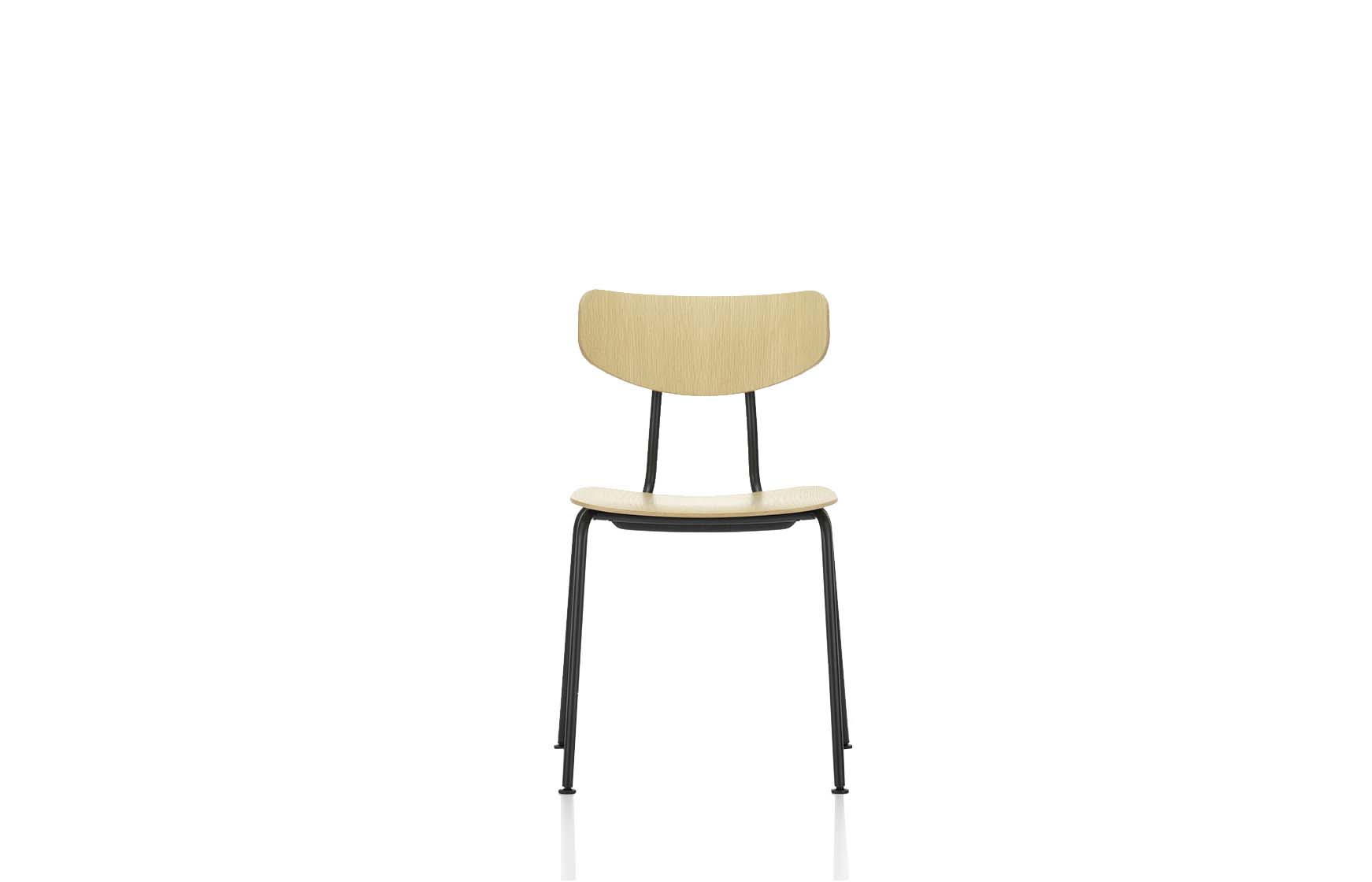 The base of Moca is constructed with two arcs of steel tubing – one forming the front legs and backrest support, the other constituting the back legs. Two veneered plywood shells are mounted on the base elements to create a comfortable, anatomically shaped seat and backrest.
